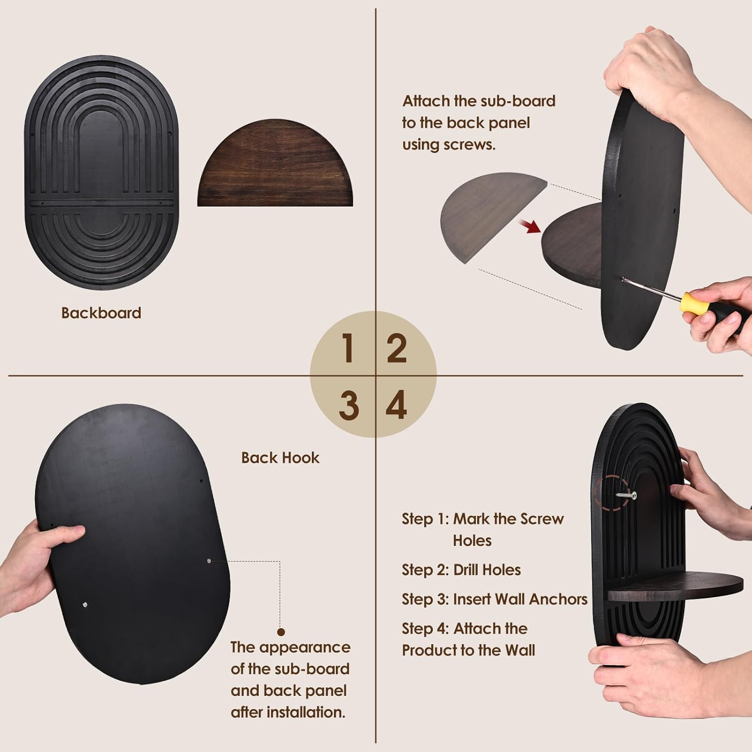 | Assembly Instructions Description | Simple installation required by screwing the two supports to the back of the shelf only takes a few minutes for easy hanging. |