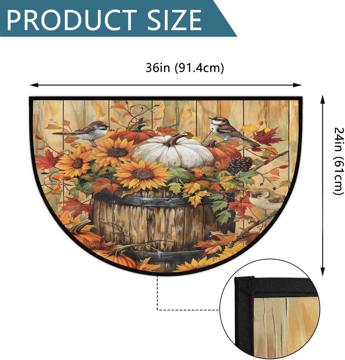 Half Round Doormat for Indoor Entrance Holiday DecorPRODUCT SPECIFICATIONSSize: 36x24in / 91.4x61cm Material: Front side --100% microfiber polyester Backside--non-skid dot plastic Shape: Half Round/Semi Circle/Half MoonPackage:1 x Half Round DoormatsPRODUCT FEATURES:1, Low Profile: The semi circle door mat rug is low profile, floor mat size is 36 x 24 inches, which is perfect size to dress up your door.2, Anti-skid Backing: Half round doormat has anti-skid backing, which making it non-slip and not easy to move.3, Machine Washable: Our half moon door mat is easy to clean, it is machine washable, you can use a damp cloth dipped in a small amount of mild soap to wipe.4, Absorption:The semi circle floor mat is made of soft memory foam and high-density space elastic cotton interlayer composite material, which makes the floor mat absorbent.5, Multi-Purpose Usage: Half round doormat suitable for any room, bedroom, living room, dining room, children's room, game room, study room, dormitory, kitchen, office, corridor, entrance, patio, porch, or hardwood floor, garage, home decoration.6, Perfect Gift: It can be great gift choice for Mother's Day, Father's Day, Halloween, Christmas, Thanksgiving, Birthday, New Year, Home Decor and more.