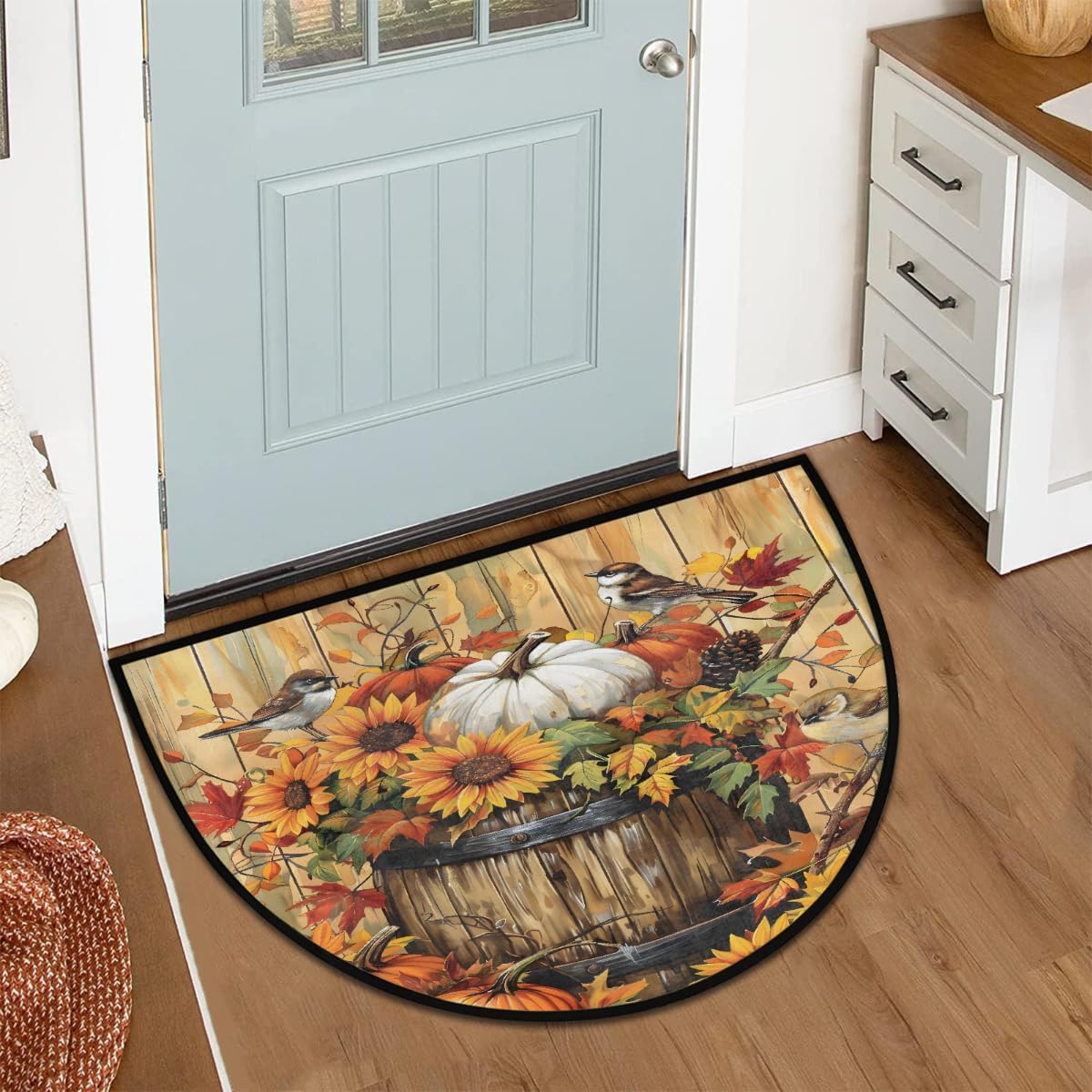 Fall Thanksgiving Bird Sunflowers Half Round Doormat Washable Semi Circle Rug Non Slip Half Moon Rug Floor Mat for Indoor Outdoor Bathroom Kitchen Fireplace Entryway Bath Holiday Decor
