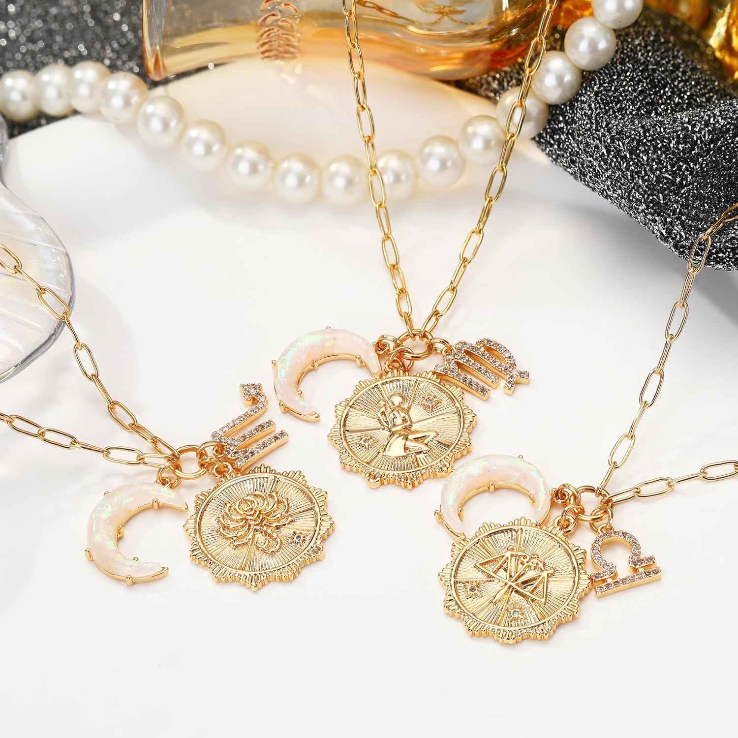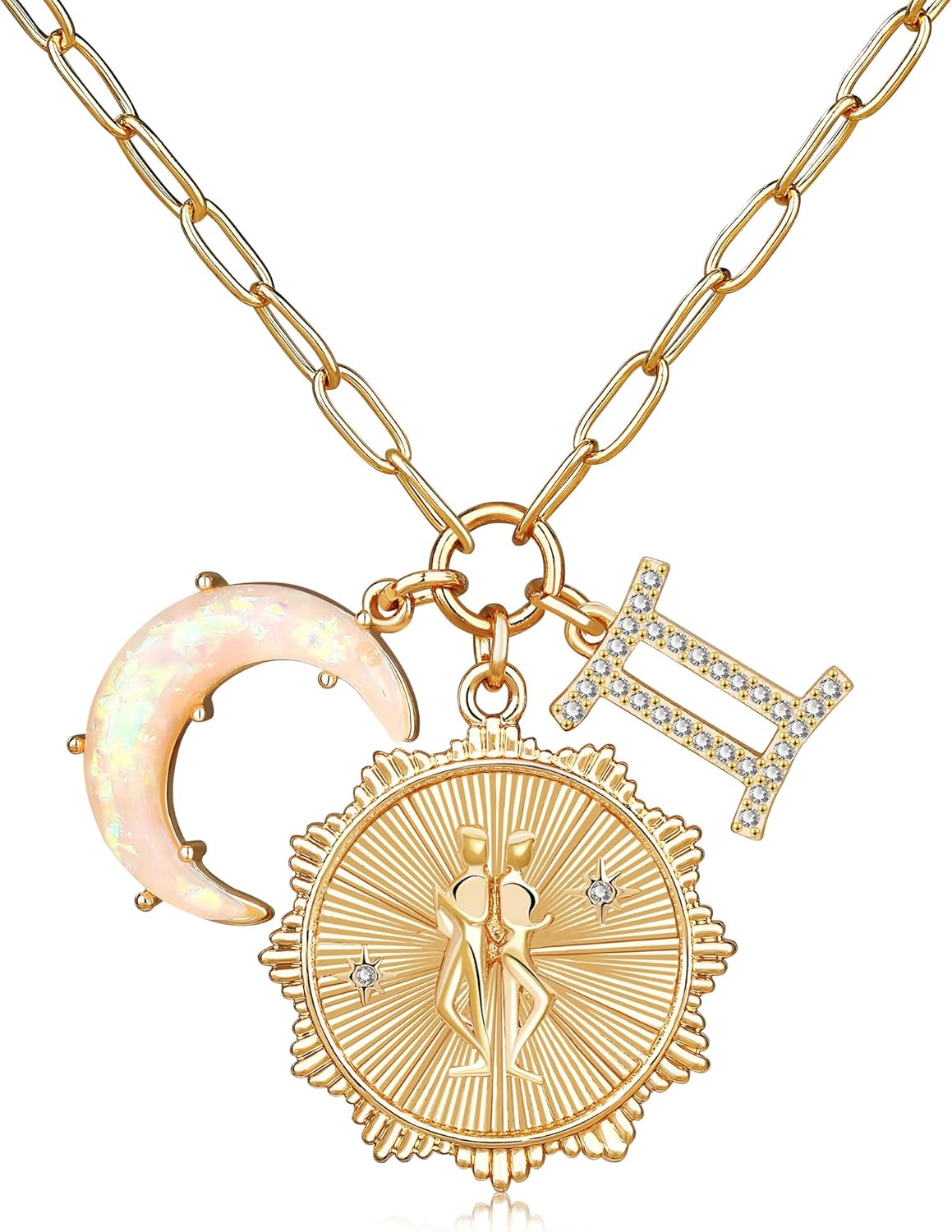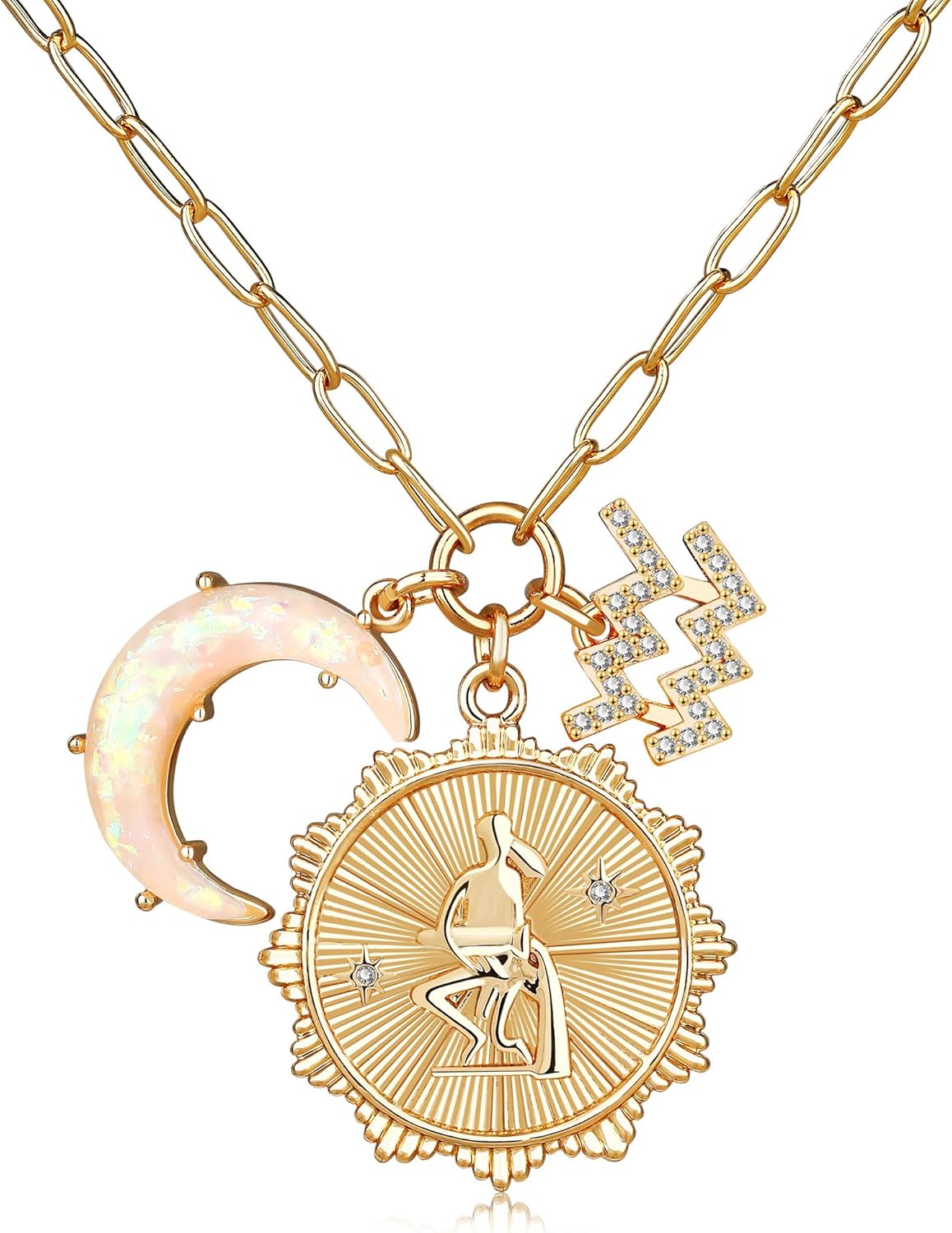 PREMIUM MATERIALS AND ADJUSTABLE SIZE: Zodiac necklace celestial jewelry; Made of high-quality brass with opalite Crescent Moon Charm, 5A Cubic Zirconia Zodiac Charm and Embrossed Constellation Coin; 21mm coin size; 18''+2.5'' adjustable chain size
