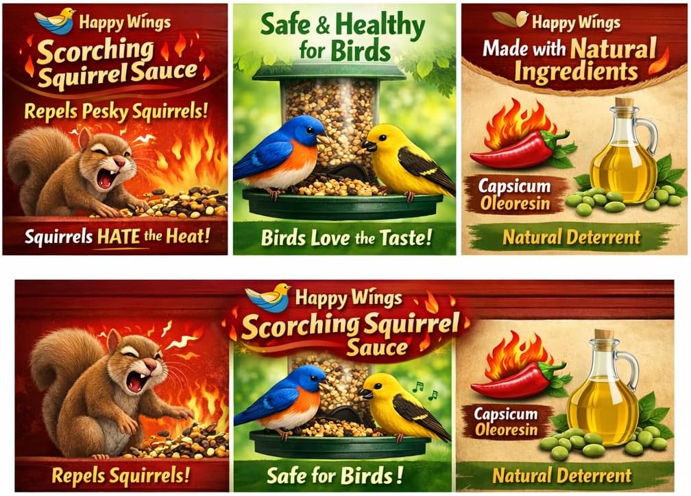 Happy Wings Scorching Squirrel Sauce for Bird Seed is an all-natural hot pepper formula. Made with capsicum oleoresin, helps attract more bird visits. As the birds lack the sense the "heat" or burning sensation from capsaicin, found in chilli peppers, allow them to consume it without discomfort. Simply mix with bird seed and let birds enjoy the feed. Free from harsh chemicals, 100% natural,ready to use, and highly concentrated, helps in attracting more birds. Intended for feeding wild birds only.