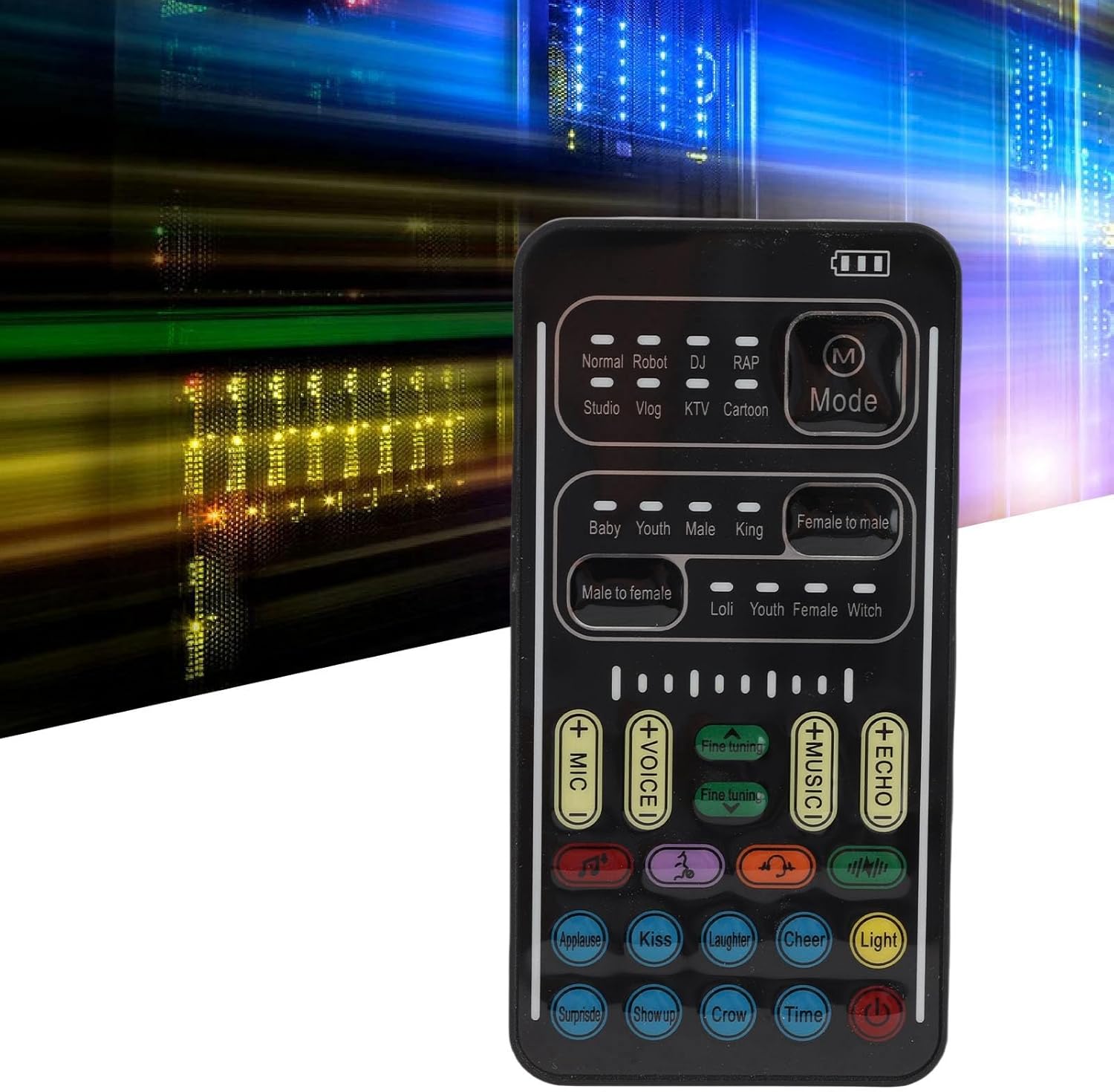 1. 8 Voice Changes: There are 8 different voice changes, namely man, woman, normal, Lolita, baby, youth, king, witch. You can also use the fine tuning to adjust each sound for more different sounds. 2. 8 Built in Sound Effects: With 8 entertaining sound effects, just press the for each sound to get fun sound effects: applause, kisses, laughter, joy, surprise, fright, crying and time. With LED lights, there is a separate to control. 3. Portable Design: Compact sound changer, easy to carry, just plug and play, no need to install any driver, very suitable for indoor and outdoor use. 4. Excellent Performance: The use of portable voice modulator can change your voice in real time in online games, combined with the use of voice changes and fine tuning, make the sound more real, achieve 80 degree voice change fine tuning, suitable for all platforms. 5. Multiple Connection Modes: The sound card supports cable connection and also has memory function, which will automatically pair with your device when working again. The interface of this voice changer is 3.5mm. Other devices with TYPE C interface need adapters. Spec: Item Type: Voice Changer Material: ABS Weight: Approx. 141g/5.0oz Color: Black Battery: lithium ion battery 450mAh (built in) Signal to Noise Ratio: 101dB Dynamic Range: 106dB Live Streaming Modes: 8 Sound Change Modes: 8 (can be fine tuned at level 10) Adjustable Electric Voice: 10 scales Version: V5.1 How to Use: Take out the product and use it. packing list: 1 x Voice Changer 1 x USB Charging Cable 2 x 3.5mm Voice Frecuency Cables 1 x SpecificationNote1. Please note that this product uses a Type-C interface. You need to prepare a 3.5mm to Type-C adapter cable.2. When powered on, Bluetooth activates automatically (default Bluetooth I9) and you can pair it directly with your mobile phone