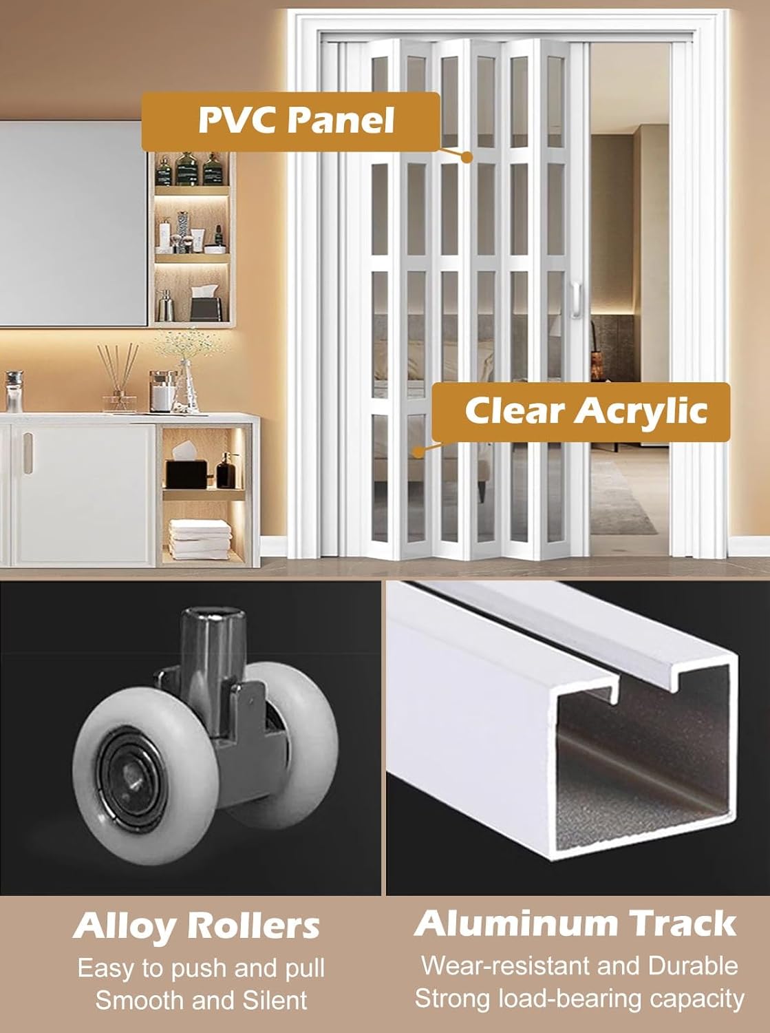 Metal Frame Indoors Security Patio Door:Transform your living space with our modern, stylish accordion folding door, designed to maximize room efficiency while enhancing aesthetic appeal. This versatile interior door is ideal for creating elegant room divisions without the hassle of traditional door installations. **Package Includes:** - Folding Door Panel - Top Tracks - Borders - All necessary installation hardware **Specifications:** - Material: Durable PVC and Acrylic Door Panel, Aluminum Alloy Top Track - Color: White Wood Grain - Door Panel Width: 15cm/17cm (6"/6.7") - Customizable Width: 60-205cm (23.6-80.8in) - Customizable Height: 203.2cm (80in) **Key Features:** - Effortless operation with smooth opening and closing, free from sticking or jamming - Sturdy PVC panels resist warping, cracking, and fading, ensuring longevity - Replaces conventional doors, freeing up valuable space in your home - Lightweight and flat design prevents deformation, is waterproof, and easy to maintain - Contemporary look that enriches your interior design - Helps reduce noise, regulates room temperature, and blocks light, fumes, and pet disturbances **Important Notes:** - Measure your doorway’s width and height carefully before making a purchase. - For optimal performance, use lubricant (not included) on the track for smooth sliding. - Dimensions may vary slightly due to manual measurement variations. - Color may vary slightly from images due to lighting and screen settings. **Customer Support:** We are committed to your satisfaction. If you encounter any issues with our product, please reach out to us for prompt assistance. Elevate your home with our accordion folding door, combining functionality and style for a seamless living experience.